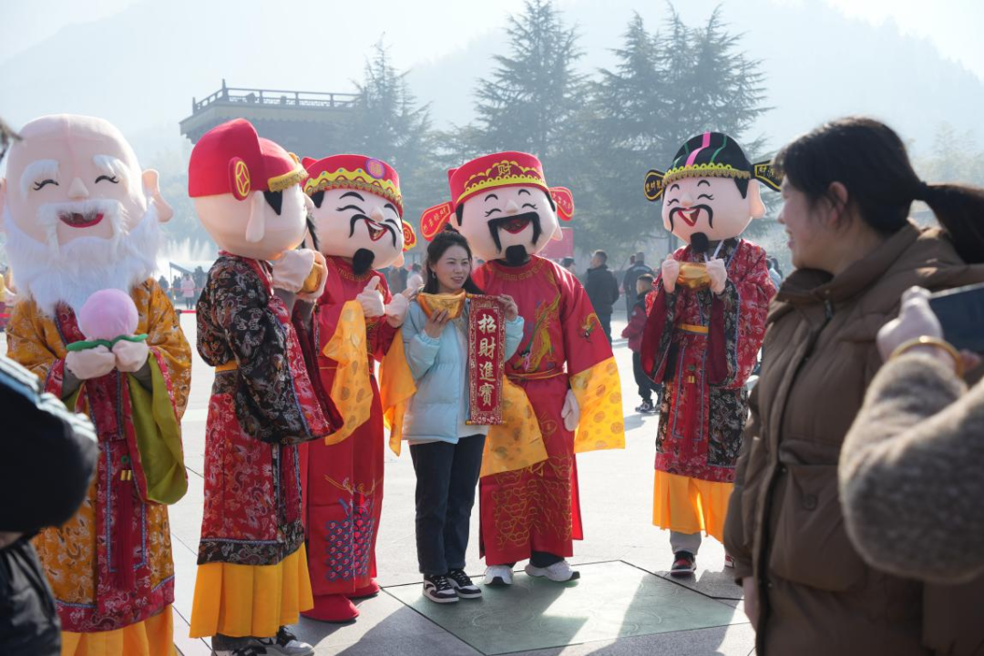 五路財神送祝福。新春佳節(jié)期間,分別在景區(qū)內(nèi)設(shè)有“福、祿、壽、喜、財”五個送福打卡點,吉祥物們不定時在園區(qū)巡游,并為游客朋友們送上真摯的龍年祝福。大小朋友們也是追著福星排隊拍照打卡,現(xiàn)場呈現(xiàn)出一片人潮涌動的祥和景象。